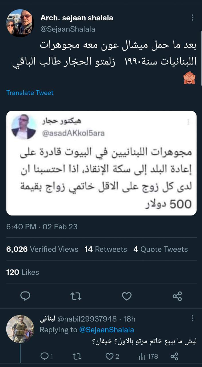 أعاد رواد موقع التواصل الاجتماعي عبر تويتر، تغريدة منسوبة لوزير الشؤون الإجتماعية في حكومة تصريف الأعمال اللبنانية هيكتور حجار بتاريخ 2/2/2023 يقول فيها "أن مجوهرات اللبنانيين في البيوت قادرة على إعادة البلد إلى سكة الإنقاذ، إذ احتسبنا إن لدى كل زوج على الاقل خاتمي زواج بقيمة 500 دولار." هنا هنا هنا هنا