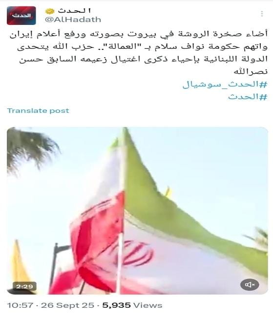 في مساء الخميس، 25 سبتمبر/ أيلول 2025، أقدم حزب الله على إضاءة صخرة الروشة في بيروت بعرض تصويري لوجهي الأمينين العامين السابقين حسن نصر الله وهاشم صفي الدين، رغم قرار الحكومة بمنع ذلك. رصدت معدة التقرير عينة عشوائية من تفاعلات المستخدمين على منصة "إكس"، حيث أظهرت ردود استياء واعتبر البعض الخطوة تعديًا على الفضاء العام وتحديًا لهيبة الدولة. ونشرت قناة "الحدث" هذه الواقعة، مؤكدة أن الحزب خرق قرار رئيس الحكومة بتصرفه المنفرد، في رسالة سياسية تهدف إلى التمرد على مؤسسات الدولة. في منشور للقناة عبر منصة "إكس":"أضاء صخرة الروشة في بيروت بصورته، ورفع أعلام إيران، واتّهم حكومة نواف سلام بـ'العمالة'... حزب الله يتحدّى الدولة اللبنانية بإحياء ذكرى اغتيال زعيمه السابق حسن نصرالله." هنا