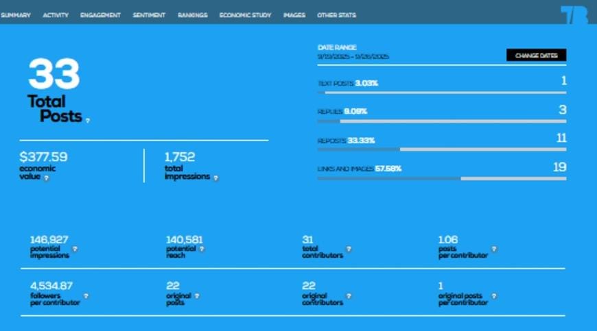 خلال هذه الفترة، تم نشر 33 منشورًا تنوعت بين منشورات أصلية، ردود، وإعادة نشر، وبلغ إجمالي الانطباعات الفعلية 1,752 انطباعًا، بينما قُدر الوصول المحتمل للمستخدمين بنحو 140,581، مع انطباعات محتملة وصلت إلى 146,927. من حيث نوع المحتوى، استحوذت المنشورات التي تضمنت روابط وصور على النسبة الأكبر بنسبة 57.58% (19 منشورًا)، تلتها إعادة النشر بنسبة 33.33% (11 منشورًا)، ثم الردود بنسبة 9.09% (3 ردود)، في حين لم تتجاوز المنشورات النصية نسبة 3.03% (منشور واحد فقط).