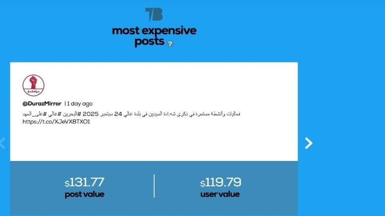 حساب @DurazMirror صفحة إخبارية بحرينية معروفة بصوتها الجريء في الدفاع عن القضايا الإنسانية والسياسية، وحقق أحد منشوراتها أعلى قيمة سوقية ضمن الوسوم المرتبطة بحملة #إنا_على_العهد بقيمة 131.77 دولارًا، بينما وصلت القيمة السوقية إجمالًا للحساب إلى 119.79 دولارًا، مما يعكس تأثير المحتوى والمشاركة الفعالة في الحملة. يركز الحساب على قضايا الاضطهاد الطائفي، منع صلاة الجمعة في جامع الإمام الصادق بالدراز، و تخليد شهداء البحرين، مع إدانة اتفاقيات التطبيع مع إسرائيل، وينقل تقارير ميدانية عن اعتقالات و استنفارات أمنية. يتابع الحساب حوالي 46,628 شخصًا، مع نشاط يومي متزايد خلال المناسبات والذكريات السنوية، ويجمع في خطاباته بين الطابع الإخباري والعاطفي لدعم المقاومة الفلسطينية والقضايا الشيعية المحلية.