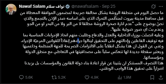 وكان رئيس الوزراء اللبناني نواف سلام قد غرد على منصة "إكس" بتاريخ 25 سبتمبر/ أيلول، مؤكداً أن ما حصل في منطقة الروشة يشكل مخالفة صريحة لمضمون موافقة محافظ بيروت التي نصت على عدم إنارة صخرة الروشة أو بث أي صور ضوئية عليها. وطلب سلام من وزراء الداخلية والعدل والدفاع اتخاذ الإجراءات اللازمة لتوقيف الفاعلين وإحالتهم للتحقيق، محذراً من أن هذا التصرف يشكل انقلاباً على الالتزامات ويضر بمصداقية الجهة المنظمة، لكنه شدد على أن ذلك لن يثني الحكومة عن بناء دولة القانون والمؤسسات.