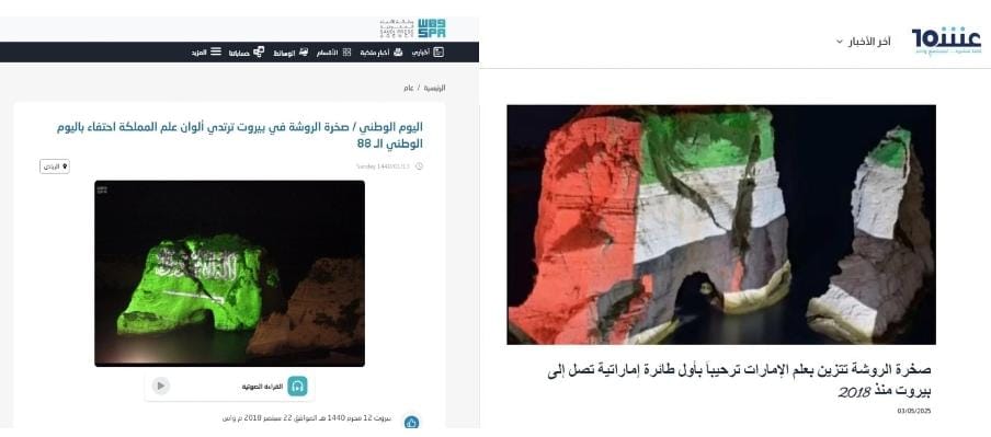 فقد نشرت قناة العربية بتاريخ (17 سبتمبر / أيلول 2025) مقالًا بعنوان: "صورة نصر الله على صخرة الروشة.. تفجر زوبعة في لبنان"، مستعرضة آراء النواب وأهمية الصخرة كمعلم سياحي. هنا