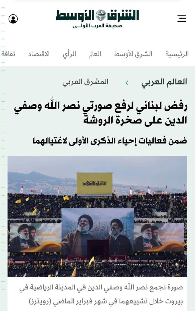 كما رصدت معدة التقرير مقال جريدة الشرق الأوسط بتاريخ (17 سبتمبر/ أيلول 2025) بعنوان: "رفض لبناني لرفع صورتي نصر الله وصفي الدين على صخرة الروشة" نشر فيه تفاعل فئة من المواطنين وبعض من النواب على هذا الخبر. هنا