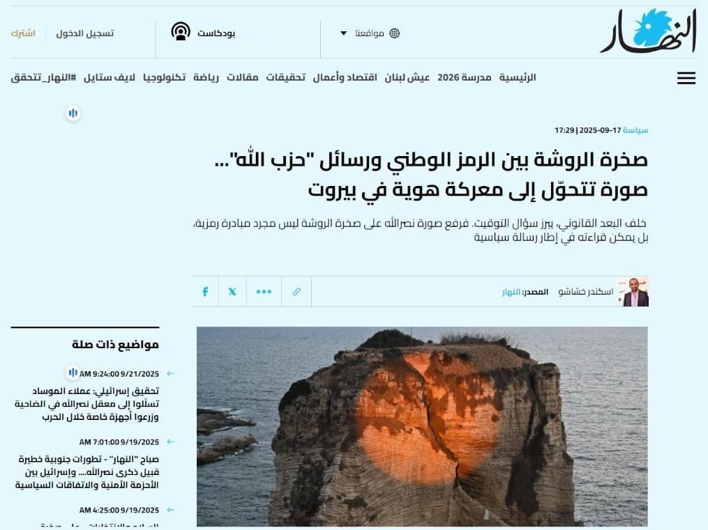 في مقال نشرته جريدة "النهار" في 17 سبتمبر/أيلول 2025 بعنوان: "صخرة الروشة بين الرمز الوطني ورسائل حزب الله... صورة تتحول إلى معركة هوية في بيروت" أثار جدلاً واسعًا حول الحدود المهنية في العمل الإعلامي، وما إذا كانت هذه الصياغة تقع ضمن حرية التعبير المشروعة أم أنها تنزلق نحو خطاب الكراهية والتحريض.