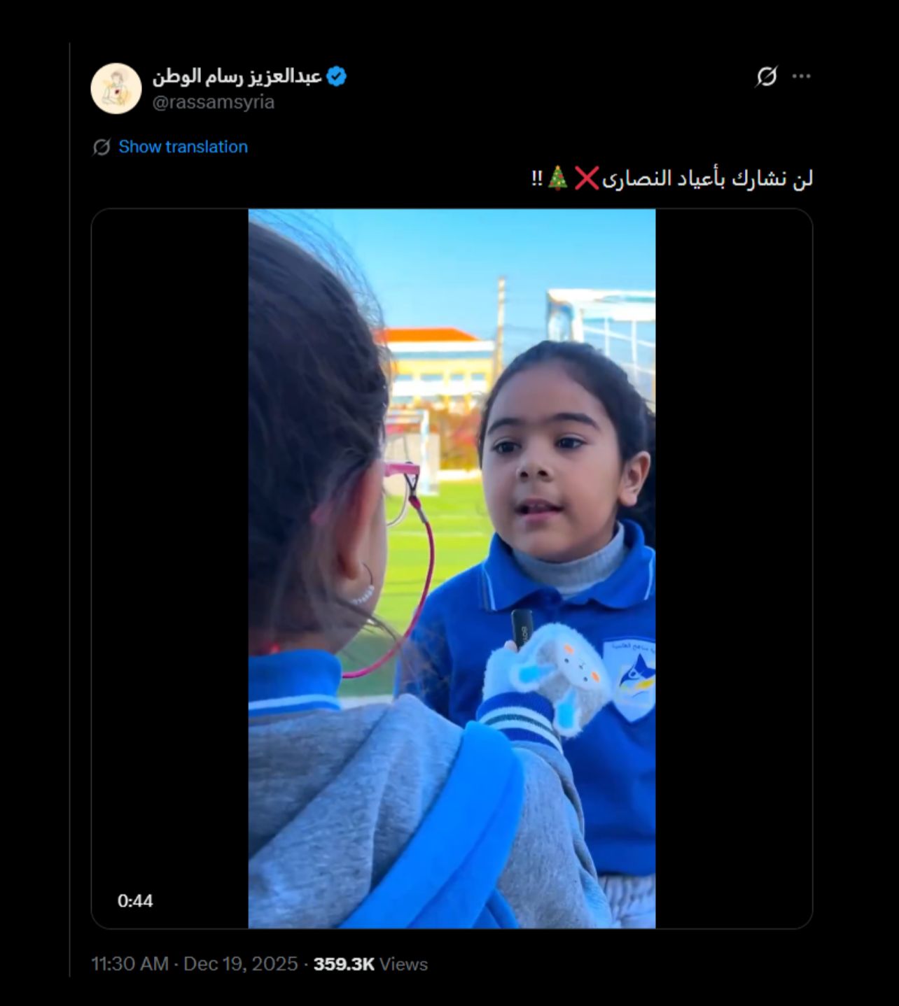 رصد فريق "شييك" بتاريخ 19 ديسمبر/كانون الأول 2025 عيّنة عشوائية من 31 تغريدة تناولت مقطع الفيديو المتداول، وانقسمت الآراء بين معارضين اعتبروا المحتوى تعزيزًا لخطاب الكراهية وغسلًا لأدمغة الأطفال ووصفوه بالتطرّف أو مرض نفسي، ومؤيدين أعادوا نشر المقطع ورأوه تعبيرًا عن الدين الإسلامي دون مسايرة للمسيحيين، فيما اعتبر بعض المستخدمين أنّ ما حدث لا يستوجب المحاسبة. العينة هنا،هنا ،هنا،هنا، هنا،هنا،هنا،هنا،هنا،هنا،هنا،هنا،هنا،هنا،هنا،هنا،هنا،هنا،هنا،هنا،هنا،هنا،هنا.