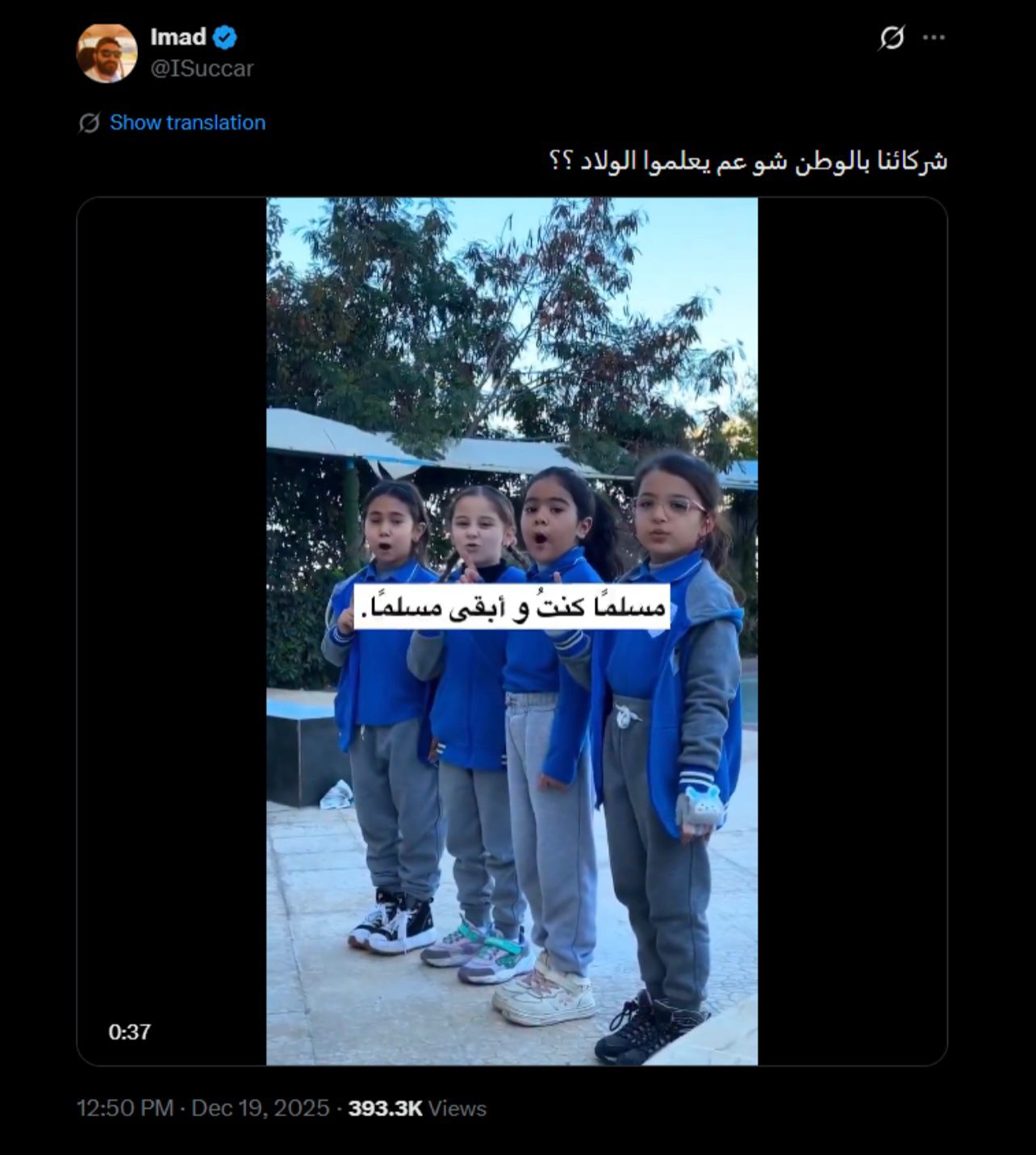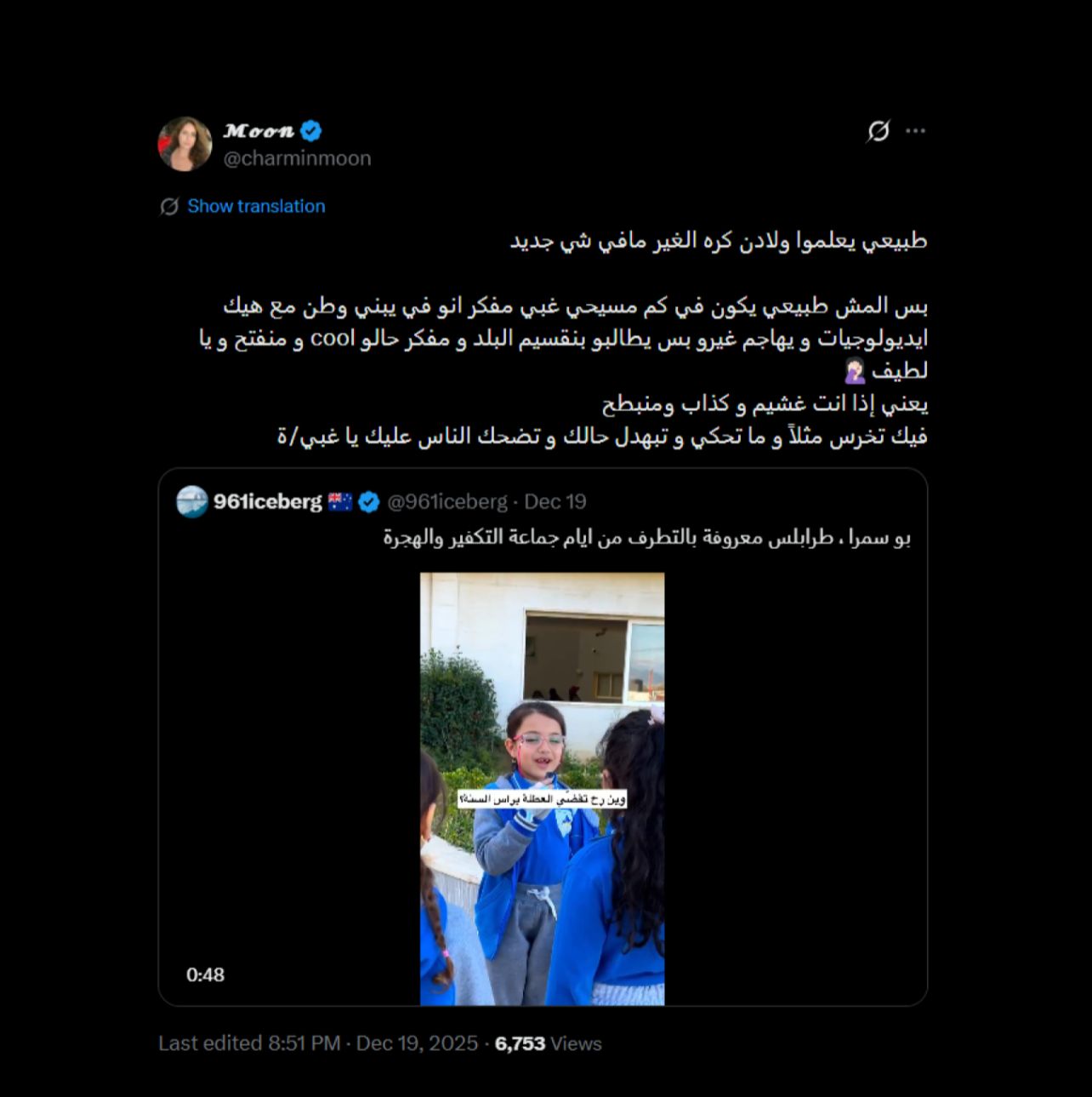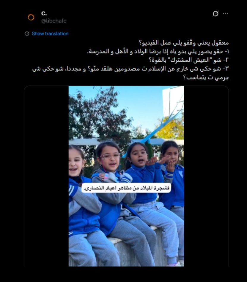 في 19 ديسمبر/كانون الأول 2025، نشرت مدرسة "مناهج العلمية" الثانوية في طرابلس فيديو على منصات التواصل الاجتماعي يظهر أطفالًا يتحاورون حول الاحتفال برأس السنة الميلادية والتقاط الصور مع شجرة الكريسماس، حيث جاءت إجاباتهم: "أعوذ بالله"، و"أنا لا أتشبه بالكفار"، و"نحنا مسلمين لا نشارك بأعياد المشركين"، ما يوحي بأن التقاط الصور مع الشجرة يُعدّ اعترافًا وتعظيمًا لأعياد النصارى. يوضح هذا المقطع كيف يمكن للمؤسسات التعليمية، عمدًا أو دون قصد، أن تتحول إلى منابر لنقل رسائل إقصائية أو تمييزية، خصوصًا عندما يُستَخدم الأطفال للتعبير عن مواقف عقائدية تجاه فئات دينية أخرى. كما يبرز الفيديو المخاطر الأخلاقية لتورط الأطفال في نقاشات دينية حساسة وغياب التوازن التربوي في التعامل مع الرموز والاحتفالات ذات البعد الثقافي والديني، ويشكل مثالًا واضحًا على انتشار خطاب الكراهية المغلف بالدين في المدارس، مع تداعيات على وعي الأجيال تجاه الآخر المختلف دينيًا أو ثقافيًا، ويطرح تساؤلات حول مسؤولية المدارس ووسائل الإعلام في ضبط الرسائل الموجهة للأطفال بما يعزز قيم التعايش والتسامح.