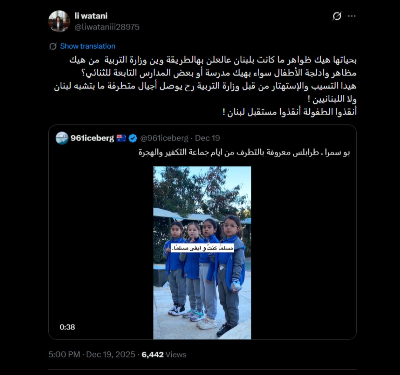 وتُظهر تغريدة أخرى لـ li watani استنكارًا لانتشار هذه الظواهر في لبنان، معتبرةً أن ما حدث يمثل أدلجة ممنهجة للأطفال واستهتارًا من وزارة التربية والتعليم في مراقبة الخطاب داخل المدارس، محذّرة من أن استمرار هذا النهج سيُنتج أجيالًا متطرفة لا تشبه هوية لبنان المتنوعة. ودعت صاحبة التغريدة إلى "إنقاذ الطفولة ومستقبل لبنان" من محاولات الزجّ بالأطفال في صراعات فكرية ودينية لا يدركون أبعادها. هنا