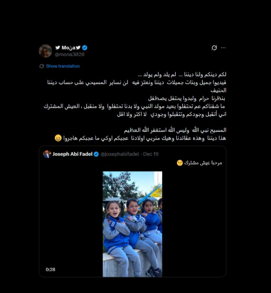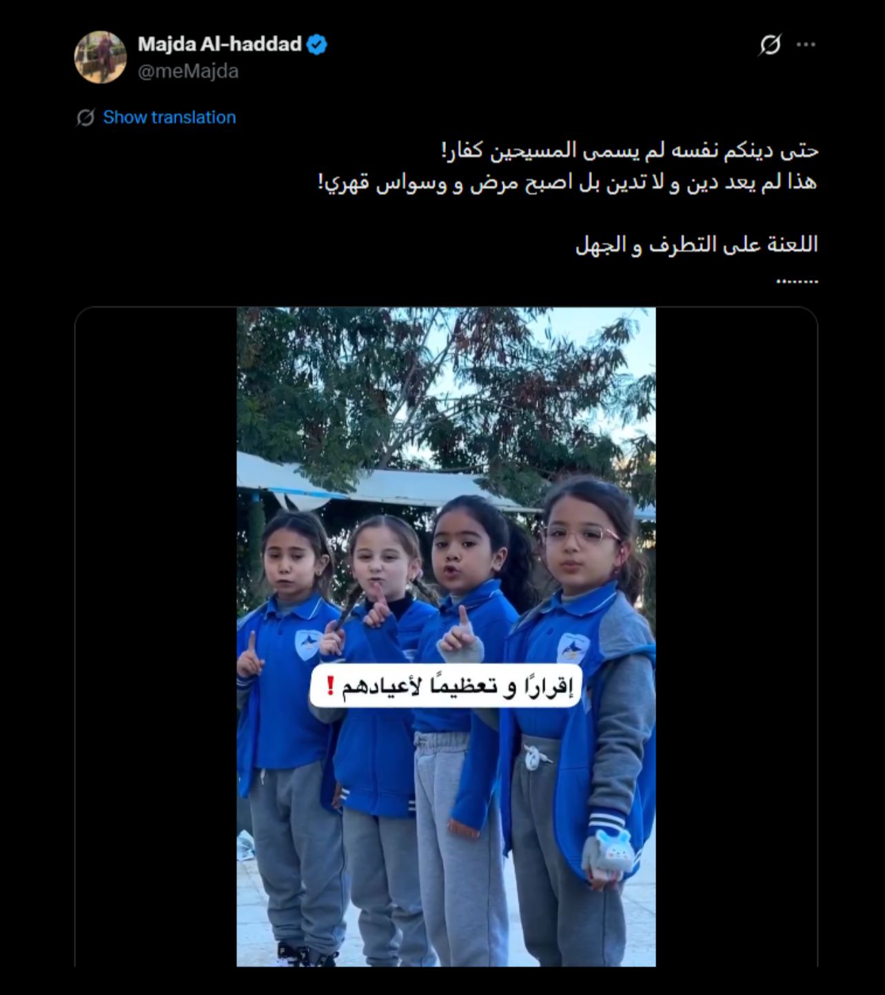 وفي تغريدة أخرى، أبدت Majeda استياءها من تصرّف المدرسة واستخدامها لوصف "كفار" في حديث الأطفال عن المسيحيين، موضحةً أن الدين الإسلامي لم يطلق هذا الوصف على المسيحيين في سياق التعامل المجتمعي، تكشف هذه التغريدة جانبًا مهمًا من النقاش، إذ تعبّر عن رفض ضمني لاحتكار الخطاب الديني وتوظيفه في إقصاء الآخر. هنا