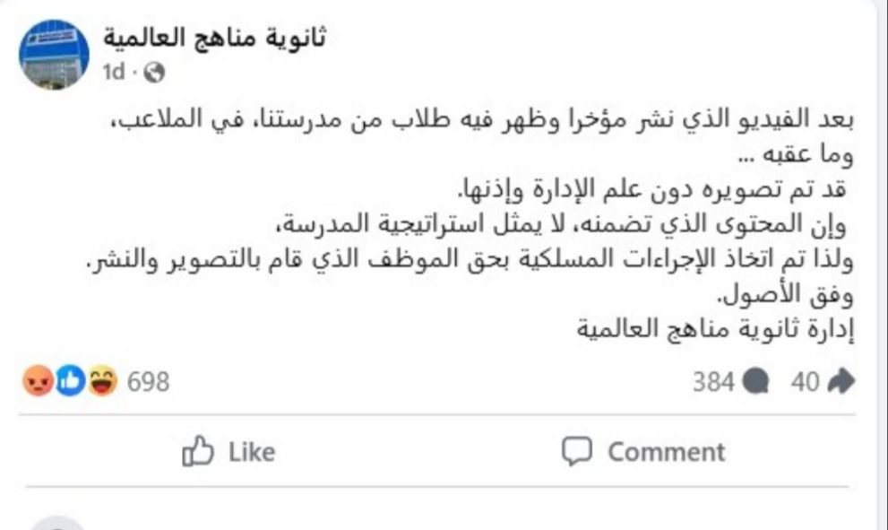 ومن خلال التحقق من الصفحة الرسمية للثانوية على منصة فيسبوك، تبيّن خلوّها تماماً من الفيديو المتداول، حيث أكدت الإدارة أن المحتوى الوارد في الفيديو لا يعكس بأي شكل من الأشكال استراتيجية المدرسة التربوية أو توجهاتها الوطنية والتعليمية التي تحرص على غرس قيم التسامح واحترام الآخر. وبناءً على ذلك، أعلنت الإدارة عن البدء الفوري باتخاذ سلسلة من الإجراءات الصارمة بحق الموظف المسؤول عن التصوير والنشر، مؤكدة التزامها بالمحاسبة والشفافية. هنا